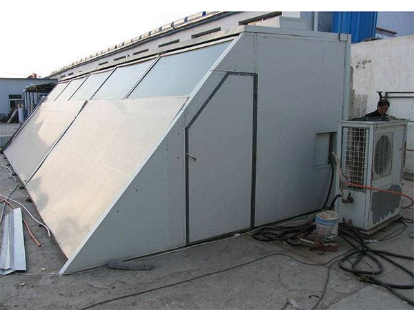 熱泵助推式太陽能烤房主要由太陽能空氣集熱器、空氣源高溫熱泵、智能化烤房系統三部分組成。通過太陽能空氣集熱器對空氣進行加熱,利用循環風機通過管道將高溫空氣傳輸到烤房在烤房內通過太陽能空氣集熱器對   空氣進行加熱,利用循環風機經過管道將高溫空氣傳輸到烤房內;通過溫、濕度感應器檢測,根據所測溫、濕度和干燥工藝,由智能化控制器控制空氣源熱泵的啟、停,排濕門的開、閉、實現全自動干燥。